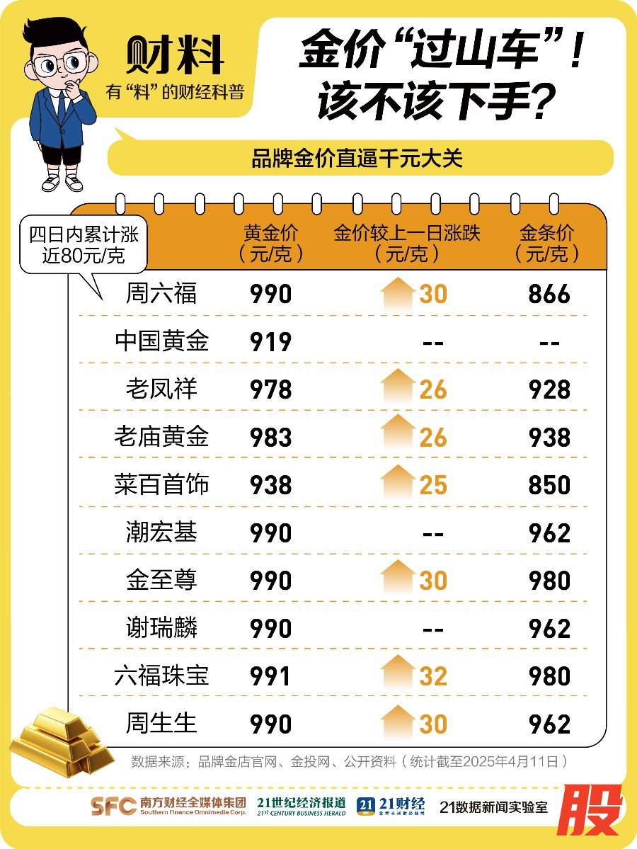 近期金价剧烈波动,开启 “过山车”式行情,4月3日COMEX黄金期货冲至3196美元/盎司后,连续3天下跌,最低破2970美元,2天跌去226美元。但随后快速反弹,4月11日突破3200美元,3天涨超200美元,足金首饰价格逼近1000元/克。年初至今,国际金价上涨约20%。再拉长时间看,自2024年4月起,国际金价一年内飙升1000美元,上海金1年涨200元/克。