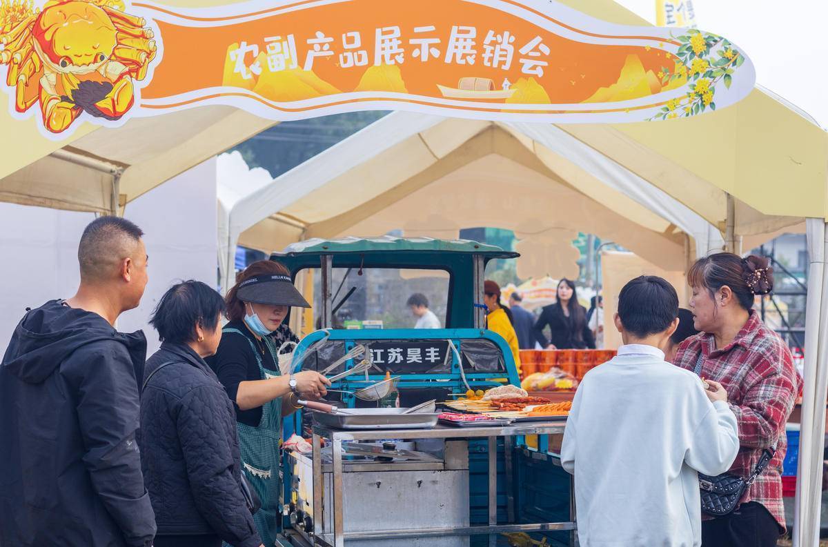 本届螃蟹集采用“主会场+分会场”双线联动模式。 在夏浴湖主会场,开幕式文艺演出于1日上午精彩上演。由本地群众自编自演的民俗节目轮番登场,非遗表演、方言戏曲等充满地域特色的演出引得掌声不断。风波岗村炫彩鼓舞队队员表演结束后继续到展位炸制红薯饼、春卷等农副产品,队长虞美珍说:“我们也自主创业一回,在这儿展销农副产品,今天的螃蟹集给我们带来了快乐和收获。”